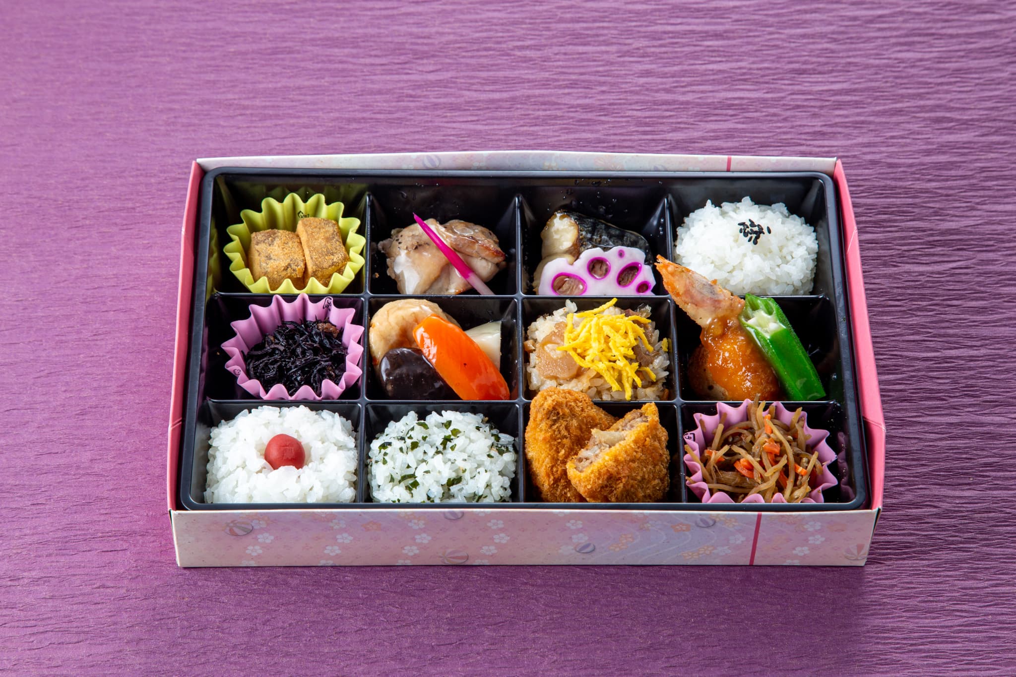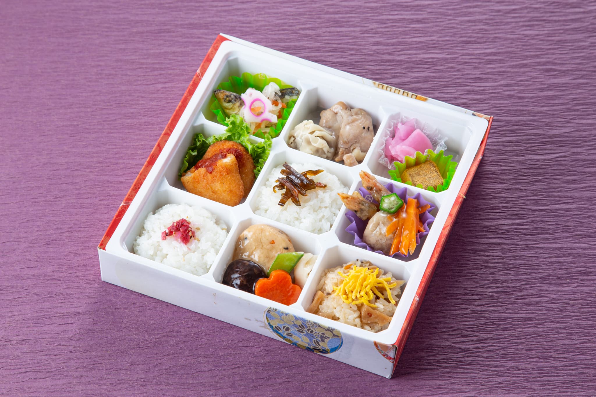 お品書き鶏の香味焼、小いわし南蛮漬け、 カニクリームコロッケのトマトソースかけ、 甘エビから揚げと肉団子野菜餡かけ、焼売、 旨辛茎わかめ御飯、五目御飯、 梅御飯、桜漬、和菓子 わらび餅 アレルギー:小麦、大豆、卵、乳成分、エビ、カニ お茶:なし サイズ:縦 21.7cm 横 21.7cm |